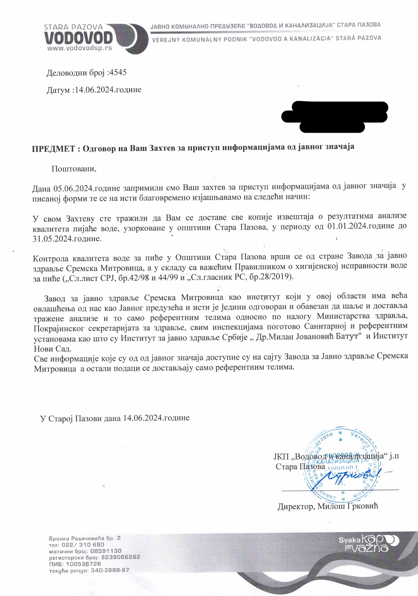 Godinama unazad, pokušavamo da dobijemo kopije izveštaja o rezultatima analiza kvaliteta pijaće vode na teritoriji naše opštine. Međutim, svaki put dobijamo isti odgovor od JKP Vodovod i kanalizacija – da oni ne mogu da nam dostave te izveštaje jer ih nisu oni radili.