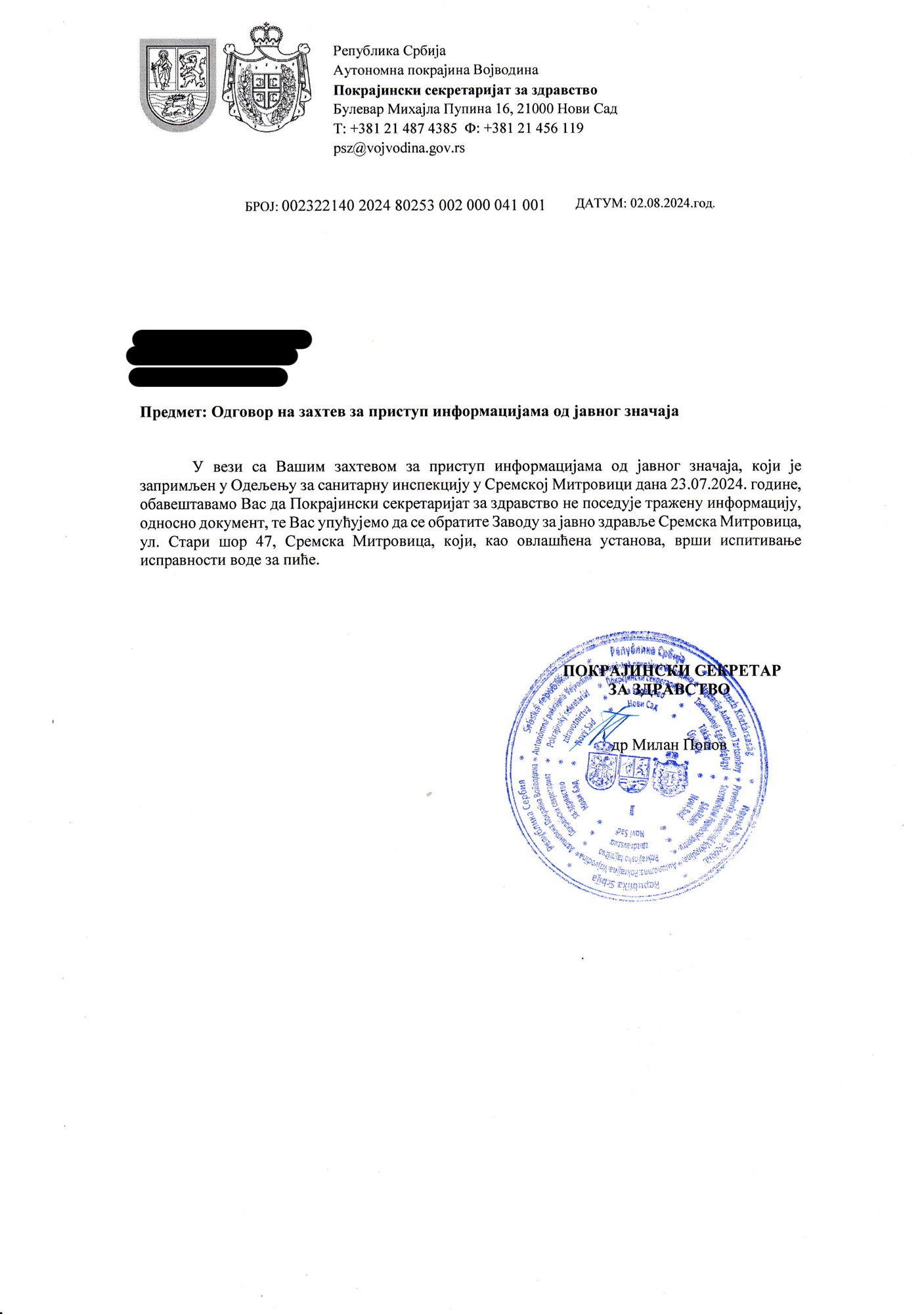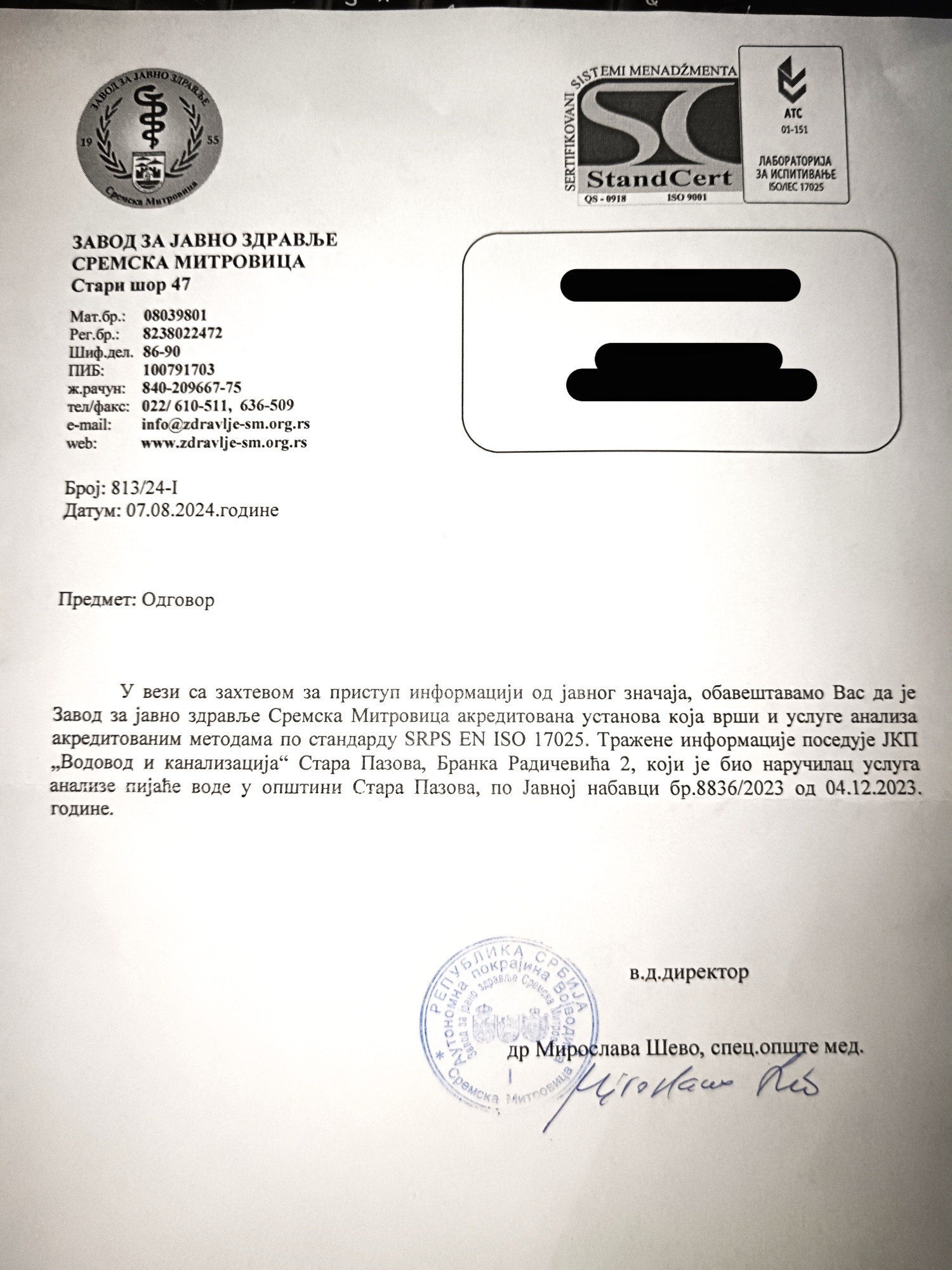 Pozivali smo Zavod za javno zdravlje Sremska Mitrovica nebrojeno puta, ali oni nas uporno obaveštavaju da ne mogu da nam dostave kopije izveštaja, jer njih plaća JKP Vodovod i kanalizacija, i upravo ta ustanova treba da nam pruži tražene informacije. Dalje, Zavod nas upućuje još i na Sanitarnu inspekciju za Sremski okrug, pošto su i oni u posedu tih izveštaja, ali Sanitarna inspekcija nas ponovo vraća na Zavod za javno zdravlje Sremska Mitrovica.